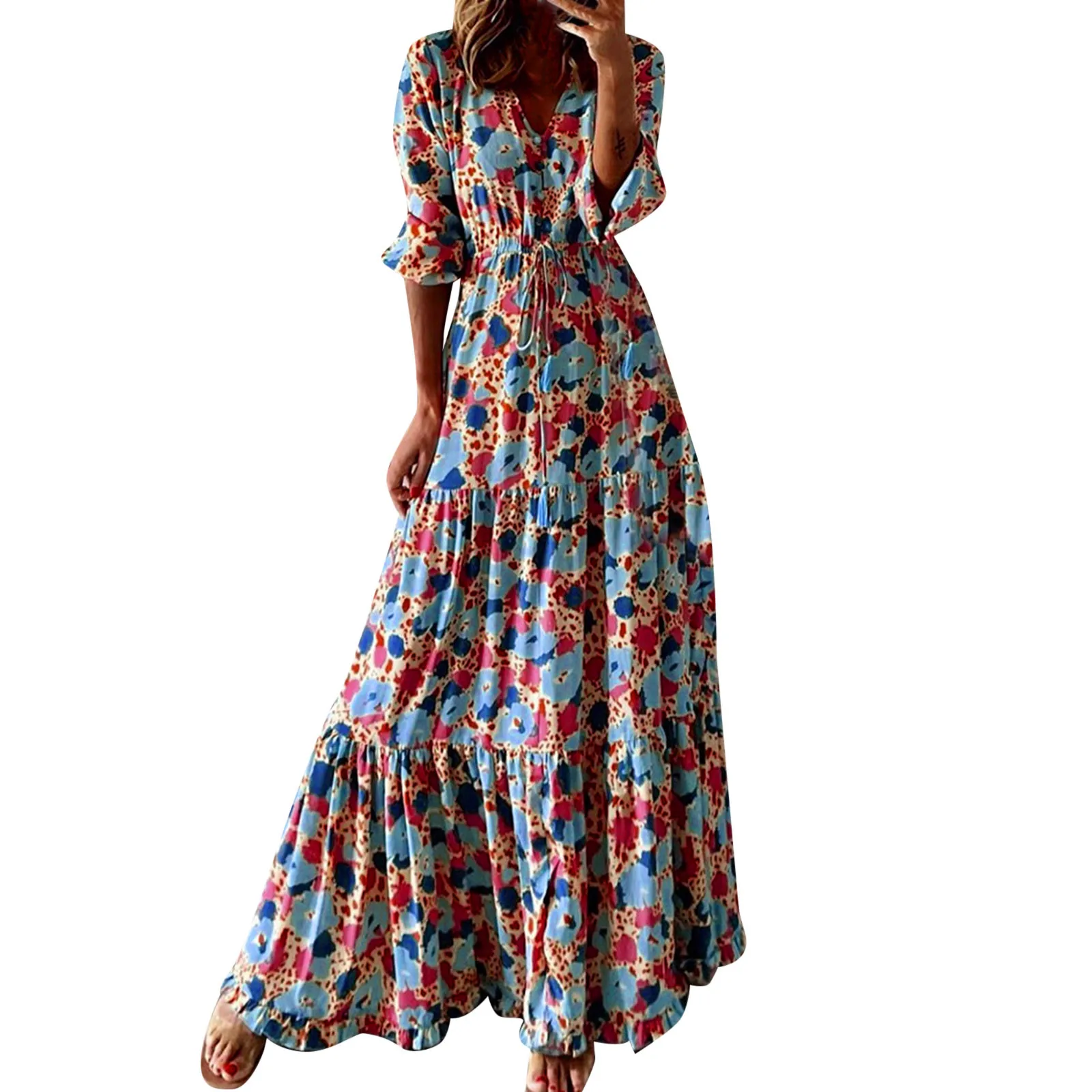 Women Fashion Print V Neck Pocket Dress Tunic Tie Long Sleeve Casual Dress