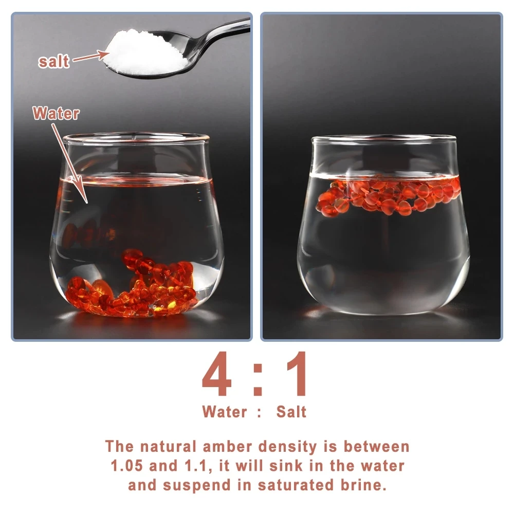 Amber is very lightweight and will not have the weight of a glass bead or even that of a solid plastic bead. To test this property of Baltic Amber, create saltwater by mixing together one part salt with two parts water. True amber beads should float in the saltwater, while glass or plastic beads sink.