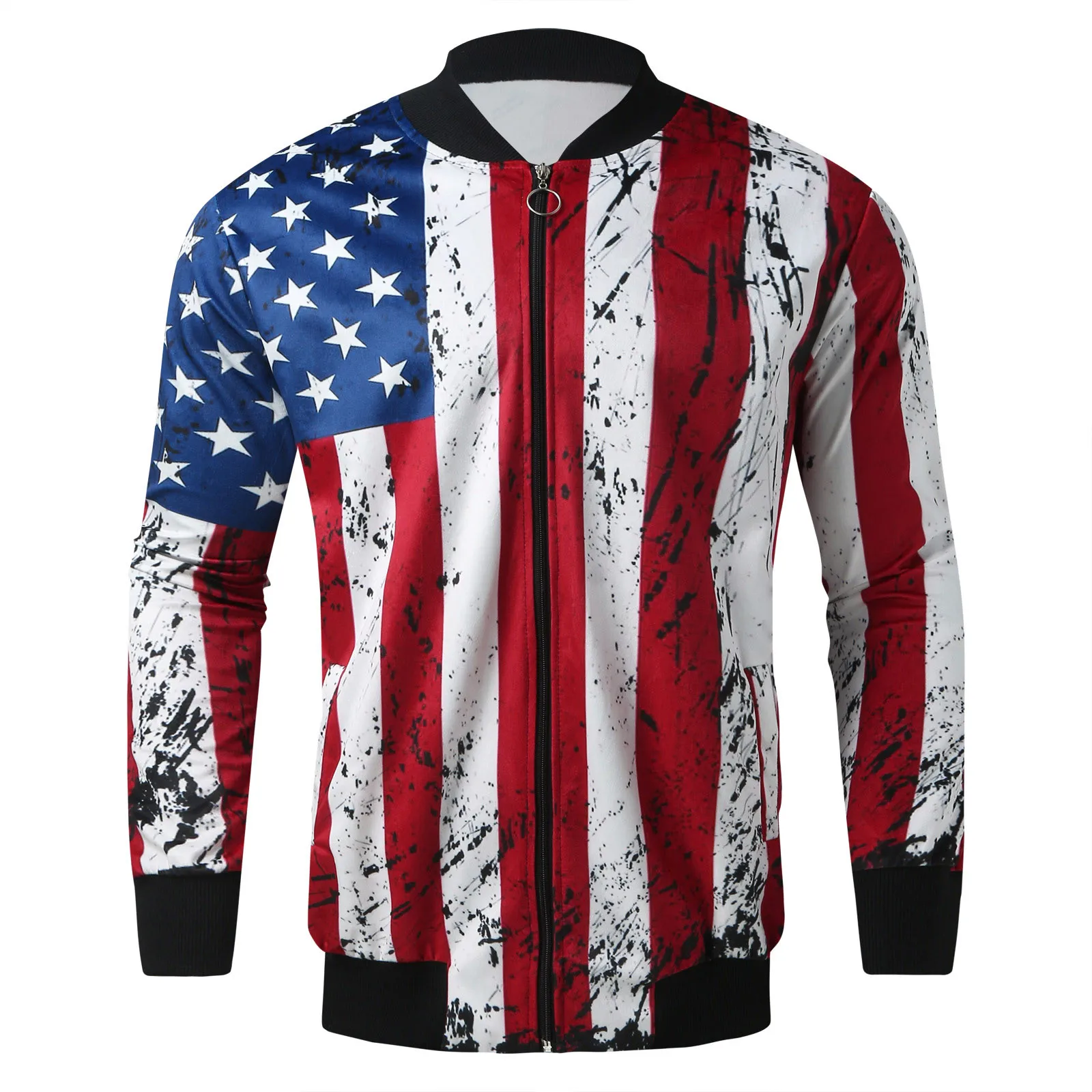 Male Casual 3D Print Slit Pocket Jacket Long Sleeve Zipper Fly Pocket Jacket Coat