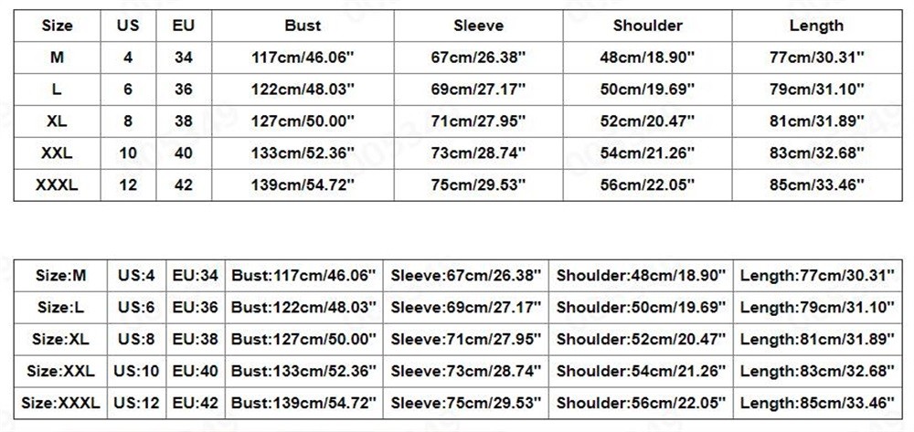 | Size:XXXL | US:12 | EU:42 | Bust:139cm/54.72” | Sleeve:75cm/29.53” | Shoulder:56cm/22.05” | Length:85cm/33.46” |