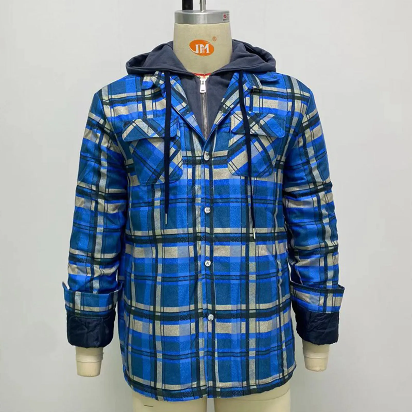 Men’s Quilted Lined Button Down Plaid Shirt Add Velvet To Keep Warm Jacket With Hood