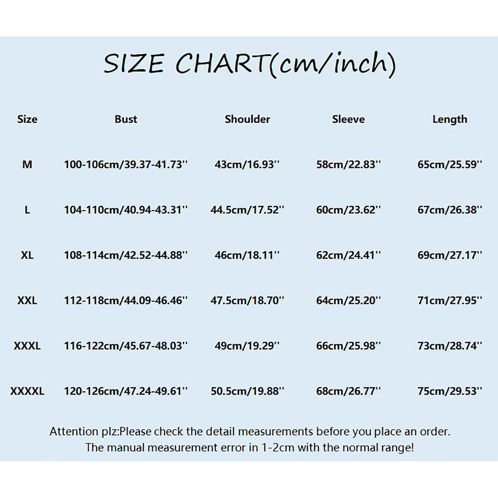| Size:XXXXL | Bust:120-126cm/47.24-49.61” | Shoulder:50.5cm/19.88” | Sleeve:68cm/26.77” | Length:75cm/29.53” |