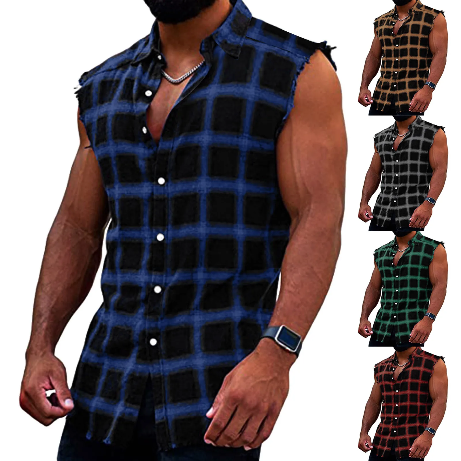 Mens Summer Fashion Casual Plaid Print Buckle Sanding Sleeveless T Shirt Vest