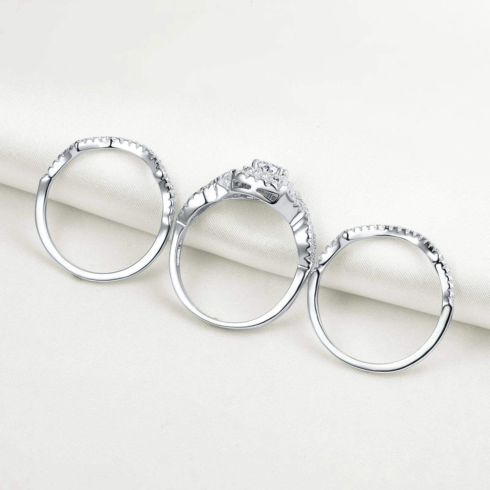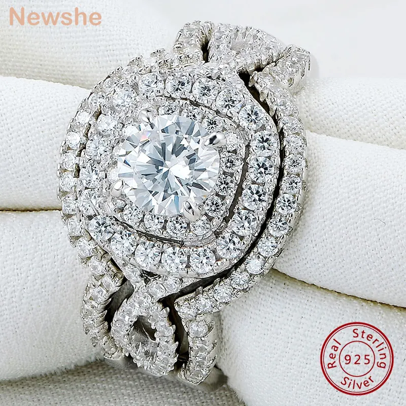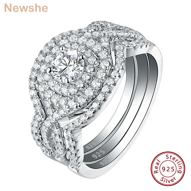 Newshe 2Pcs Wedding Rings for Women Solid 925 Sterling Silver Engagement Ring Bridal Set 1.6Ct Halo Round Cut AAAAA Zircon