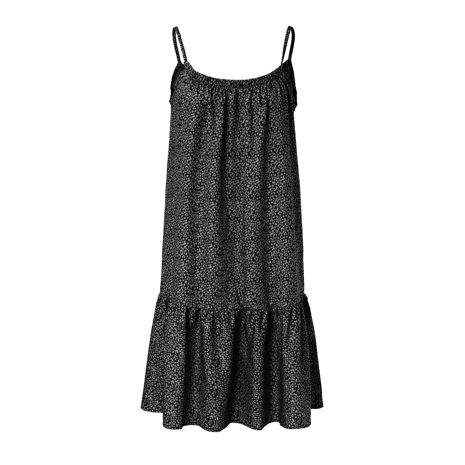 Women Casual Floral O Neck Ruffle Hem Spaghetti Strap Sleeveless Short Dress Beach Dress