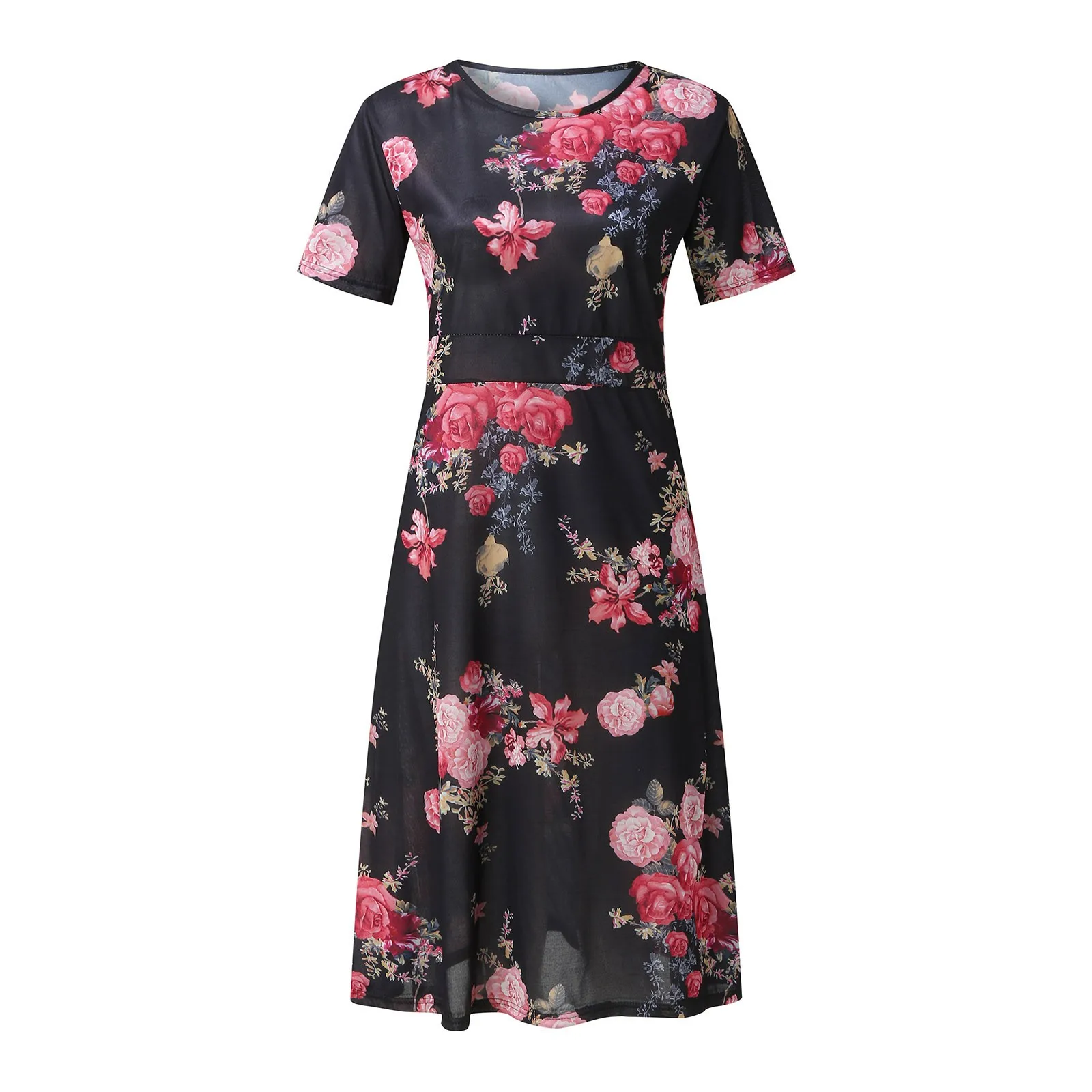 Comfortable Swing Dress For Women Fashion O Neck Short Sleeve Bohemian Floral Print Plain Fit Simple T Shirt Loose Flowy Dress