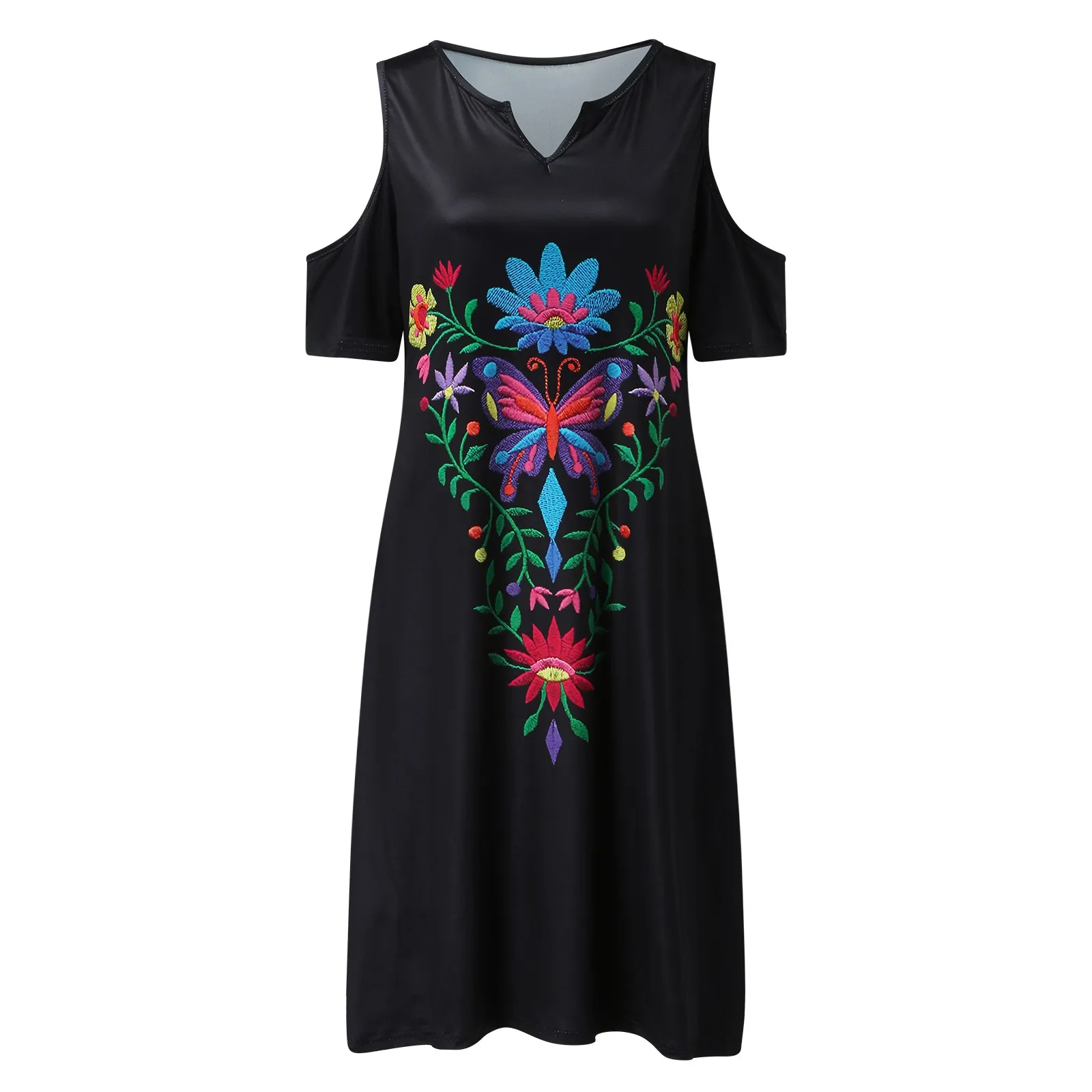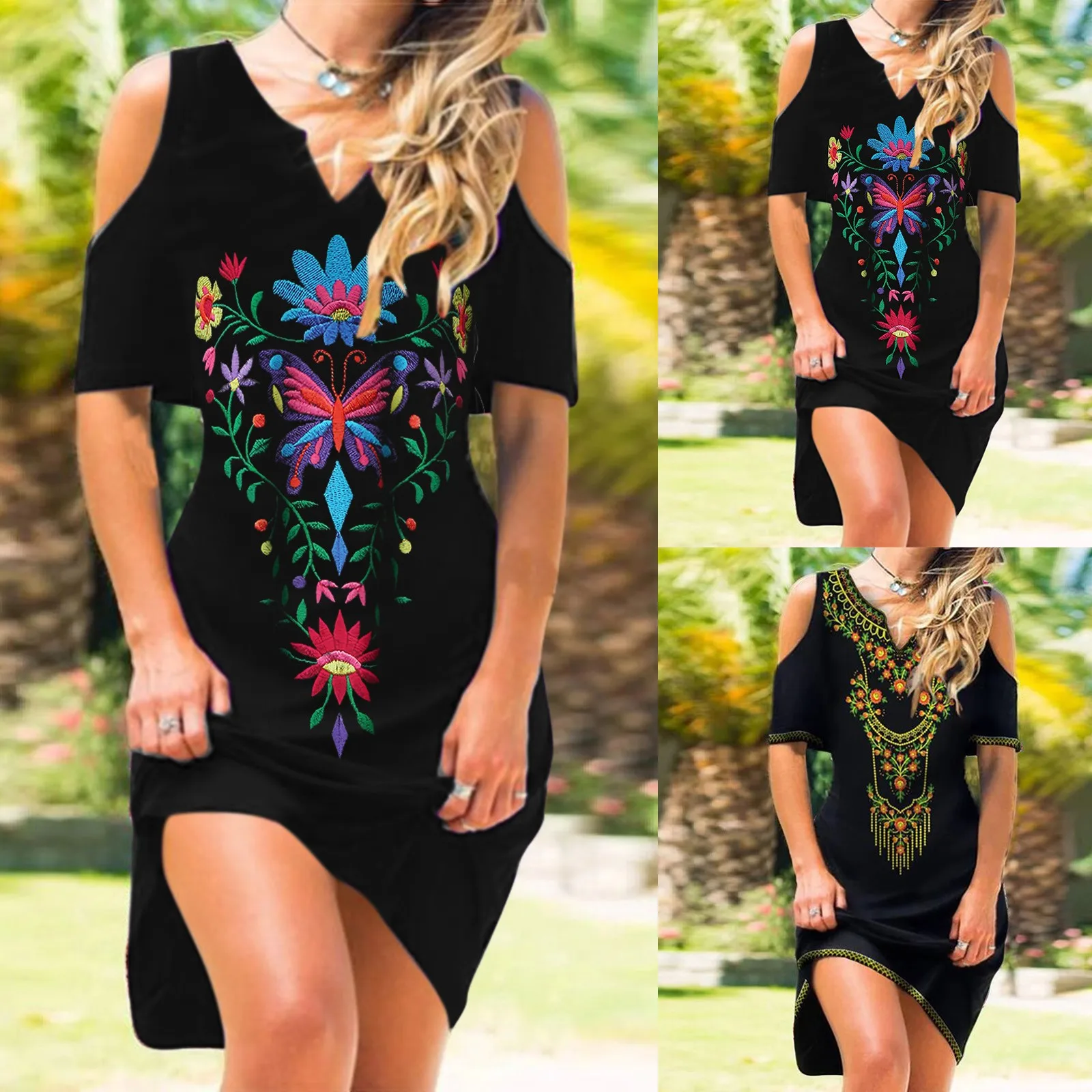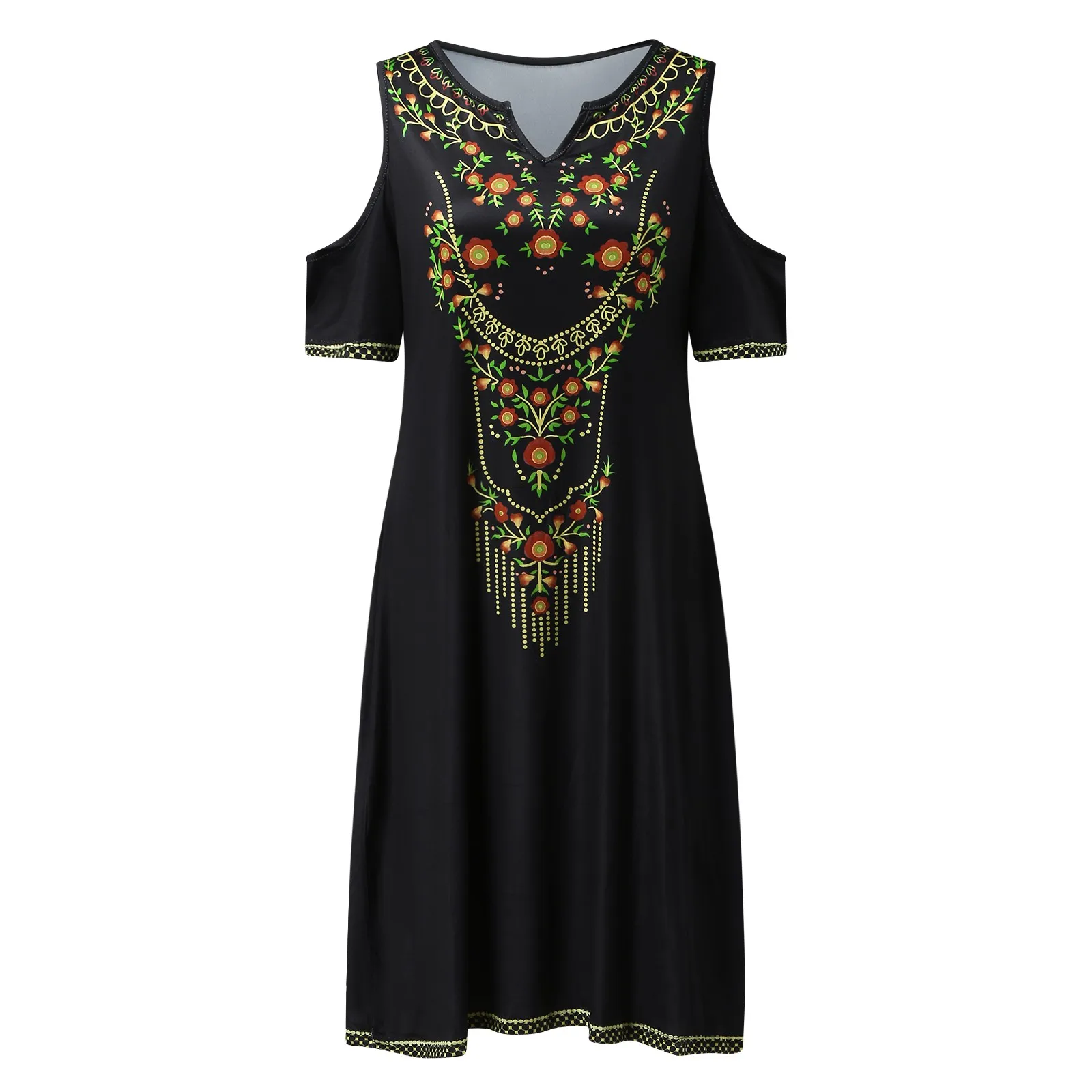 Summer Womens Casual Short Sleeve Floral Printed Print Dress V Neck Cold Shoulder Sundress Dress