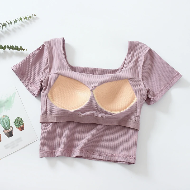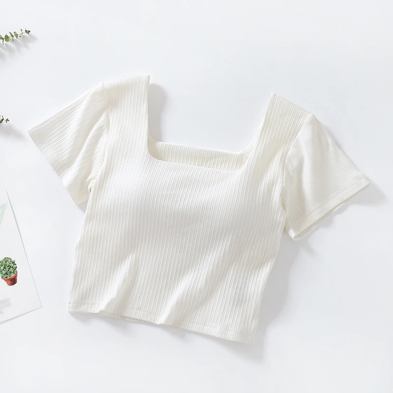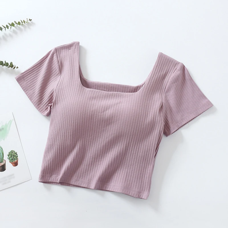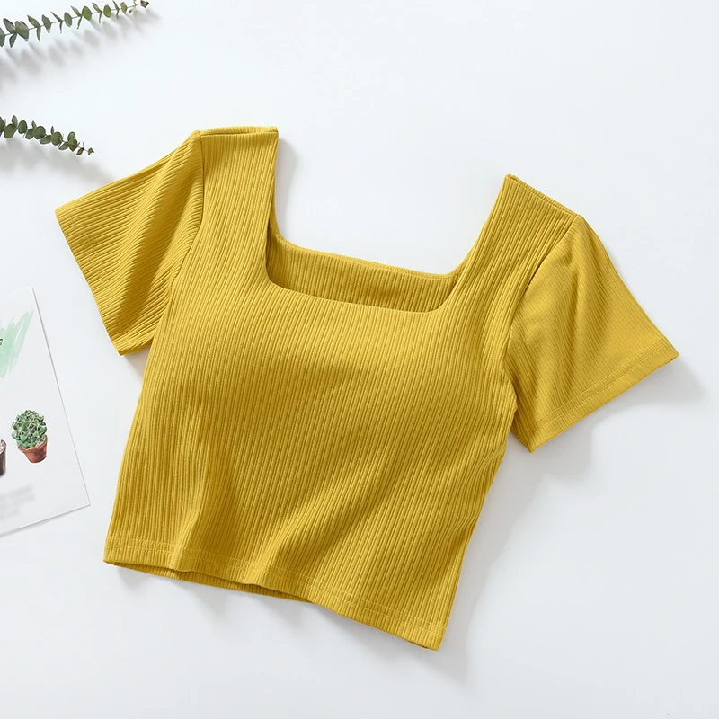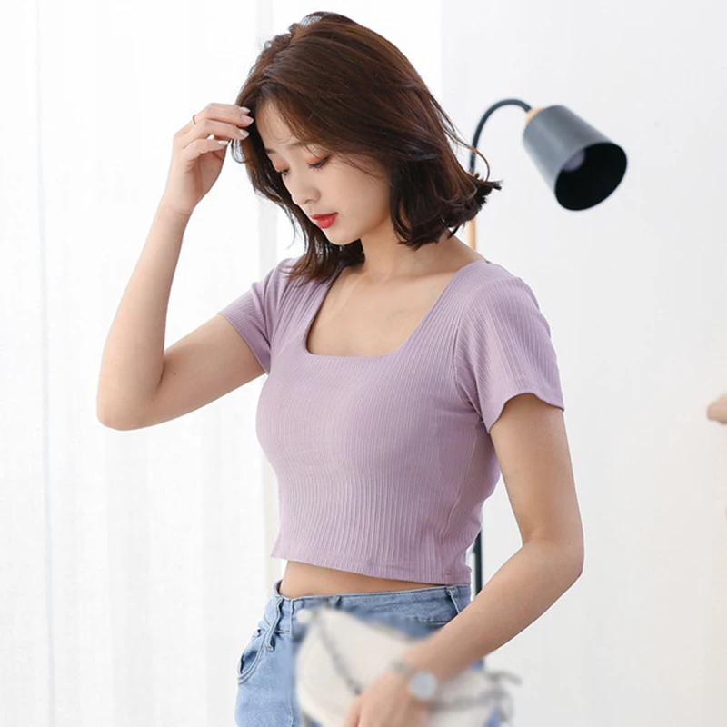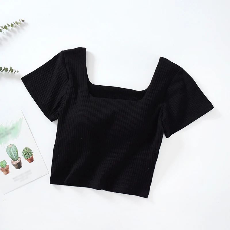 1. Korean version, self-cultivation, temperament, umbilical all-match fashion short T, girl T-shirt, solid color short T-shirt, all-match umbilical short-sleeved T-shirt, square neck umbilical short-sleeved, all-in-one short T-shirt with chest pad.